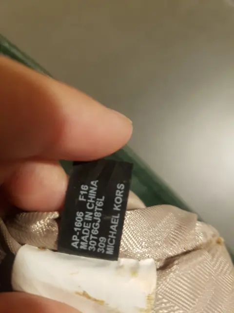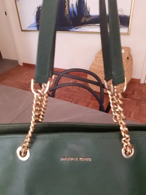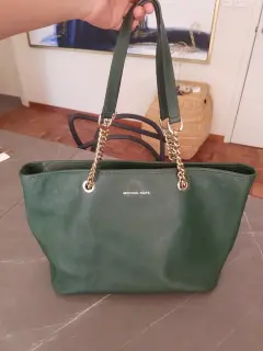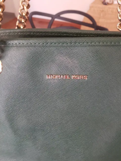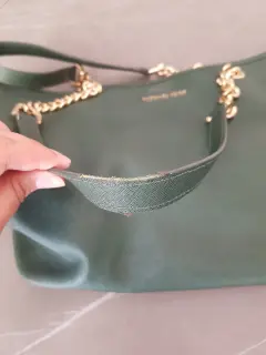 Bolsa verde MK. Bolsa verde super amplia, con asas de cadena, tiene muchos compartimentos, muy elegante, cuenta con un detalle en una de las asas que se muestra en una de las fotos
