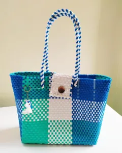 Bolso artesanal azul y verde. Grandes y resistentes. Ideales para ir a la playa o para el uso diario. Trae un llaverito que puedes quitar o poner a tu gusto. Hechas a mano con plástico reciclado. Medidas: Alto: 28 cm. Base: 30 cm. Largo en la parte superior 43cm. Ancho: 20-30cm (dependiendo de cuántas cosas le metas)