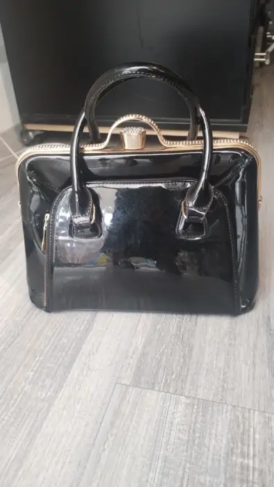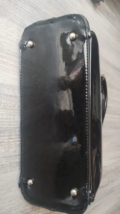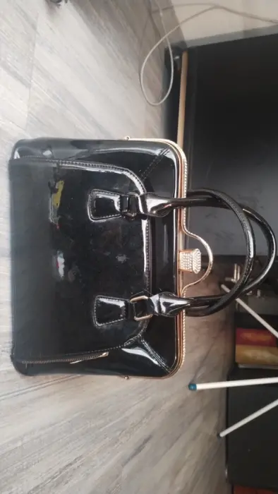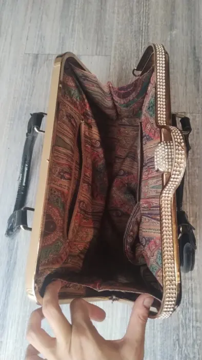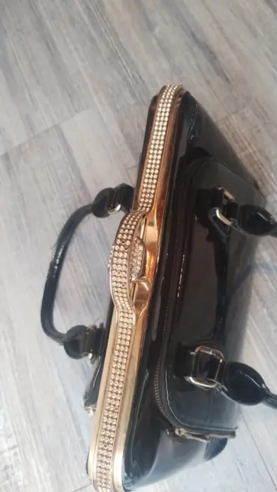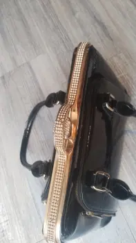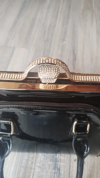 Bolso de charol, tamaño promedio, con algunos cristalitos faltantes, Pero cierra bien todo.