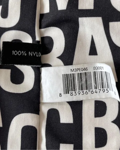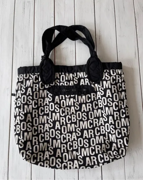 Bolso grande de nylon Marc Jacobs. Medidas en la base: 35 cm de largo por 11 cm de ancho. De alto: 35 cm hasta 40 dependiendo de lo que contenga y sin las asas. Con asas mide: hasta 64 cm vacía. Tiene dos bolsas medianas a los lados, por dentro de un lado una con cierre y del otro lado dos bolsillos pequeños. Muchos usos y muy resistente.