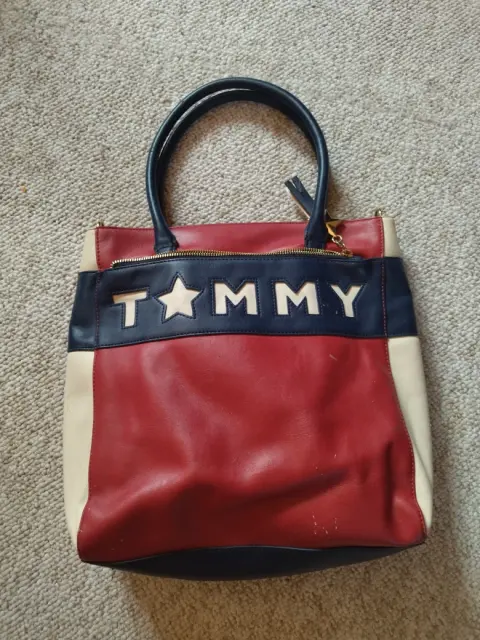 Bolso marca TOMY. De vinipiel de tres colores rojo,azul y blanco de 35cm x35cm aprox.....con tres compartimentos......con algunos detalles por uso