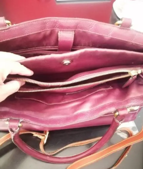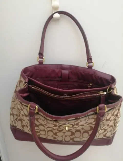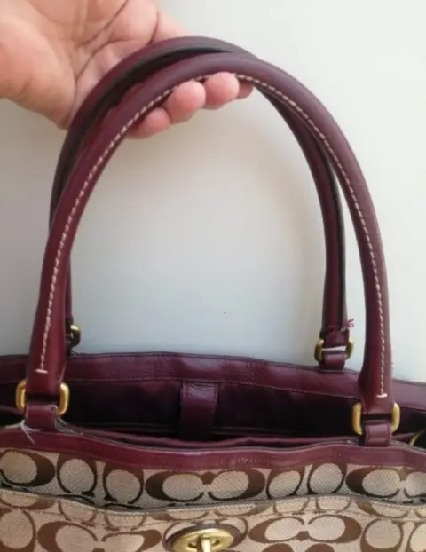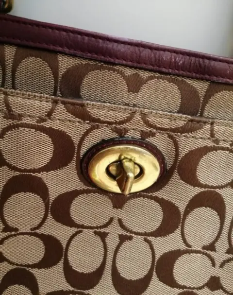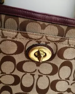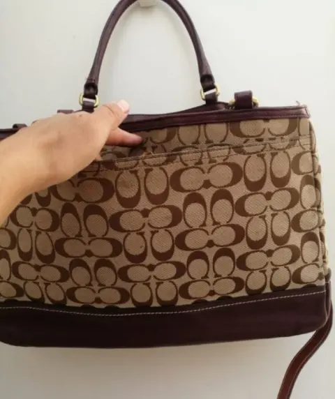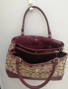 Padrísima bolsa de piel y tela tipo lona,, muy gruesa con MONOGRAMA clásico en tonos cafés,,, tiene compartimentos grandes uno de ellos acolchado , ideal para llevar tu compu,, no tiene detalles..