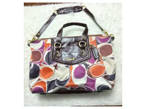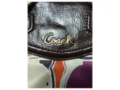 Coach tote satchel de satén original. Descripción:Coach Bolso satchel de satén con estampado de bufanda multicolor dibujado a mano de Coach Ashley y ribete de cuero. Parche interior de cuero grabado con Coach Creed y número de serie. 2 bolsillos interiores multifunción.En excelentes condiciones. Sin detalles.