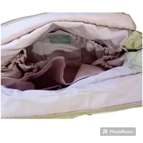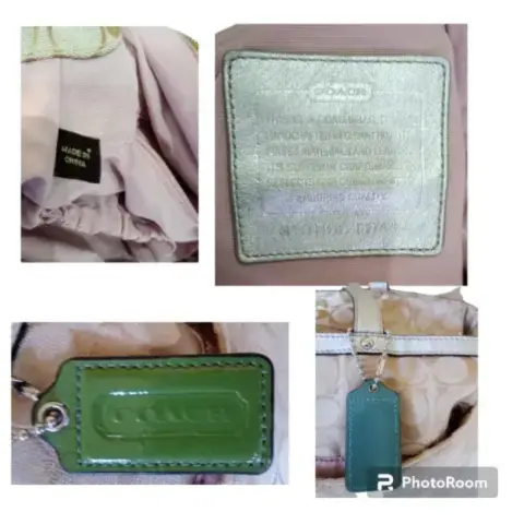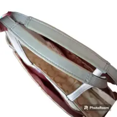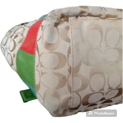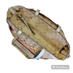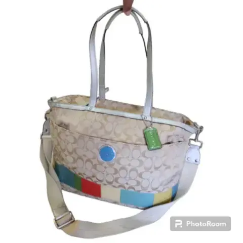Pañalera/equipaje de mano Coach monograma tela y piel color nude/plata línea de colores en piel bolsas laterales enfrente trasera con cierre 10 compartimentos internos (4 para termos) 2 con cierre asa larga ajustable Tag detalles de uso ligeros