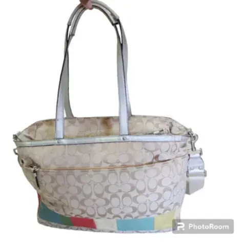 Equipaje de mano/pañalera Coach. Pañalera/equipaje de mano Coach monograma tela y piel color nude/plata línea de colores en piel bolsas laterales enfrente trasera con cierre 10 compartimentos internos (4 para termos) 2 con cierre asa larga ajustable Tag detalles de uso ligeros