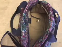 Hermosa bolsa en robot azul y morado de gran capacidad con asa larga para usar cruzada y dos asas cortas. El único detalle a mencionar desgaste en las dos asas cortas visible en las fotos. La tela de color súper firme, en muy buenas condiciones así como el forro interno.
