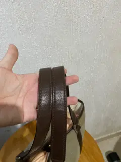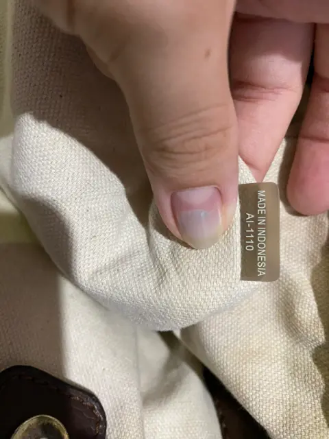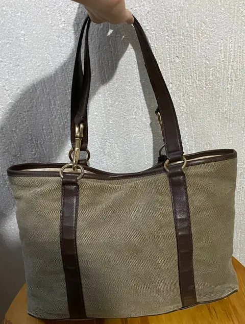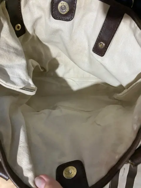 Tote en tela, exterior e interior del mismo material (tipo manta o mezclilla) por fuera está levemente manchada pero para el uso diario está perfecta, asas y bordes en piel en excelente estado.