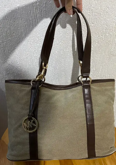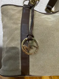 Michael Kors tote detalle. Tote en tela, exterior e interior del mismo material (tipo manta o mezclilla) por fuera está levemente manchada pero para el uso diario está perfecta, asas y bordes en piel en excelente estado.