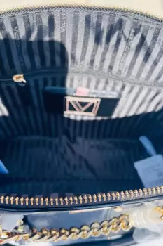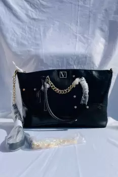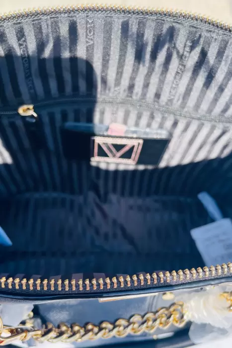 Bolso tipo Satchel color negro con apliques dorados de Victoria´s SecretNueva con etiquetasSe puede usar al hombro o con correa incluida• 1 bolsillo interior con espejo, 1 bolsillo interior con cierre.• 23 cm de largo x 12.4 cm de ancho x 12.9 cm de alto.• 13 cm de asas superiores, 60 cm de correa ajustable