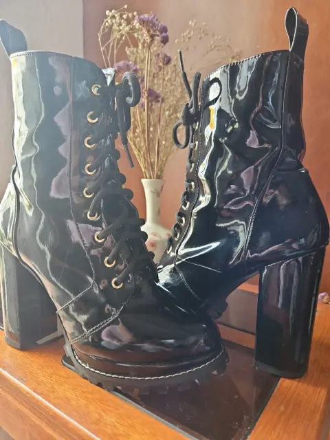 Negro es su color de estas bellas botas, plataforma cómoda. Altura pantorrilla de agujetas, ajuste cómodo. Andar seguro. Tacón ancho