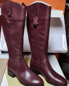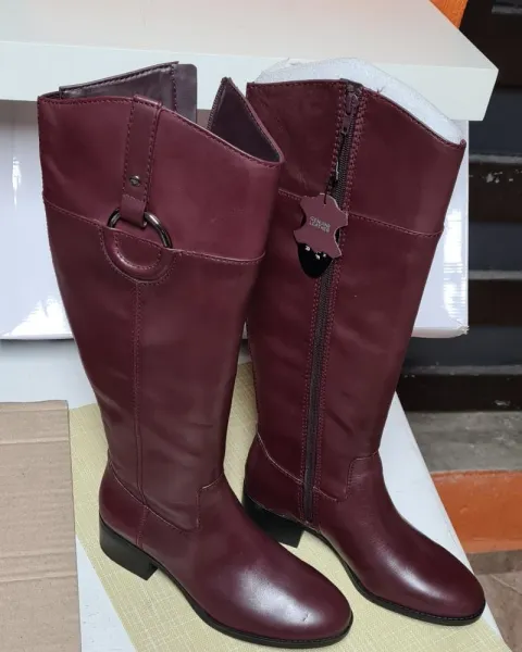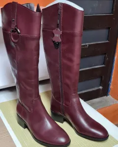Hermosas botas largas colorVino, 100% cuero genuinoTacon cuadrado de 4cm,Largo 44 cm, punta AlmendraPueden quedarle a una 24Nuevas y originales
