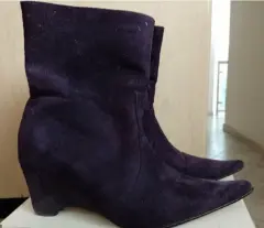 Bota morada de gamuza. Bota de color morada, tipo gamuza. La punta es en poco. El tacón mide 7cm. Tiene cierre en la parte de adentro. Se encuentra en muy buenas condiciones