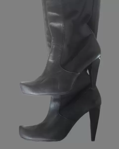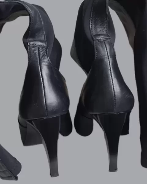 Padrisima bota larga de piel en color negro, la parte alta viene con licra para un buen ajuste, super comodas, se pueden usar largas o cortas (dependiendo como se acomoden), talla 6.5 (dan a un 5 perfecto), tacon 8cm, se usaron muy poco (muy pocos detalles de uso).