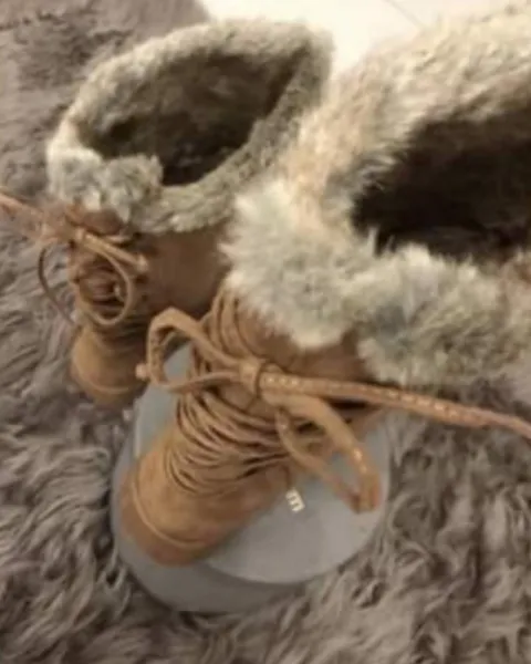 Botas de peluche con cintas ajustables muy calientitas y chic!!! Ideales para el clima son talla 4 pero también quedan a 3.5