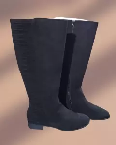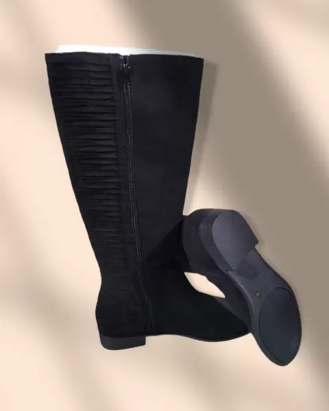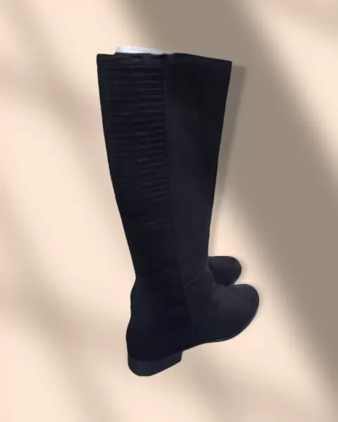 Kelly & Katie Lanner High Boots, talla 7-Mex/10-US, color negro sólido, silueta agrietada con detalles en la espalda, eje alto, hecho con parte superior de gamuza sintética, cierre interior con cremallera, punta redonda, Plantilla ligeramente acolchada, aprox. Altura del eje de 15 "Aprox. Circunferencia de ternera de 14", talón de bloque apilado 1 ¼ ", suela sintética, nuevo en la caja.
