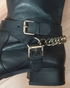 Botas altas (abajo de la rodilla) color negro. Aplicaciones de color doradocon cadena en la parte del talón, hebilla.