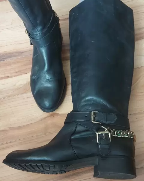Botas altas, con cadena.. Botas altas (abajo de la rodilla) color negro. Aplicaciones de color doradocon cadena en la parte del talón, hebilla.