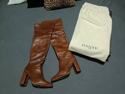 Botas altas de piel color coñac. Llegan arriba de la rodilla yo mido 1.60 y así me quedan, nada raspadas de las puntas y las tapas en excelente estado el tacón mide 9 CM de alto tienen un pequeño cierre por la parte de adentro, solo se ve el uso en la suela, se usaron en 2 ocasiones están en excelente condiciones