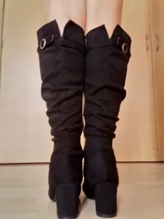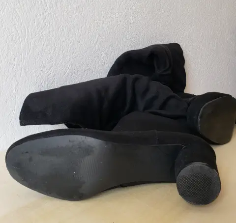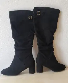 Botas altas con cierre, traen un cinturón en la parte alta como detalle, tipo gamuza, tacon mediano de 7cm, talla #6