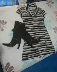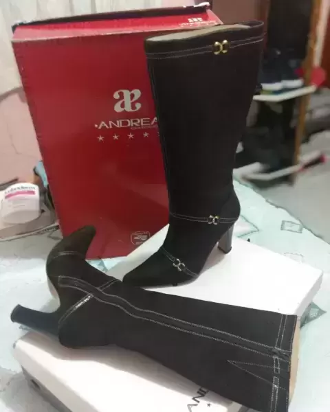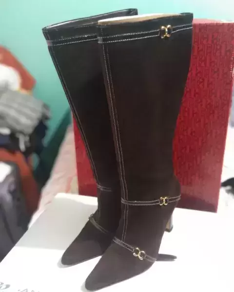 Cómodas botas hasta la rodilla, en gamuza color cafe oscuro con detalles dorados que resaltan. Pequeña avertura a los lados internos para mayor comodidad. Tacón lacado de 9cm, muy cómodos por ser tacón ancho. Talla: 22.5💝 Si te gusta algo más de mi Clóset podemos armar un paquete a un excelente precio!!