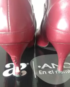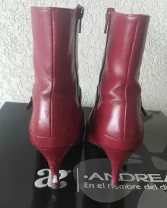 Bonitas botas cortas de tacón en piel, color vino, diseño lizo con detalle de listón delgado e hebilla discreta, con puntera cuadrada. Tacón: 7.5 cm. Talla 22.5. **Detalles en tacón, punta y en el forro interior.💝 Si te gusta algo más de mi clóset podemos armar un paquete a un excelente precio 🙂😸!!