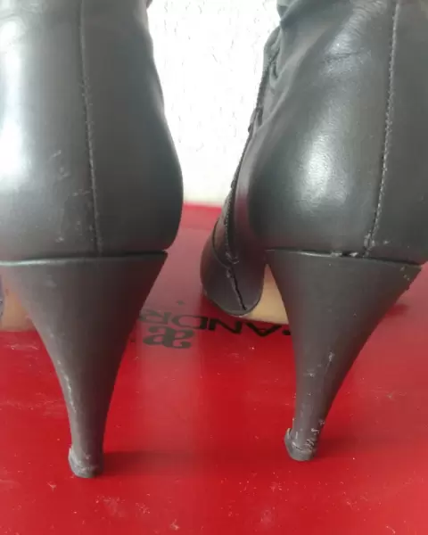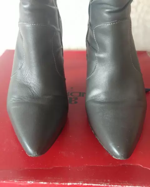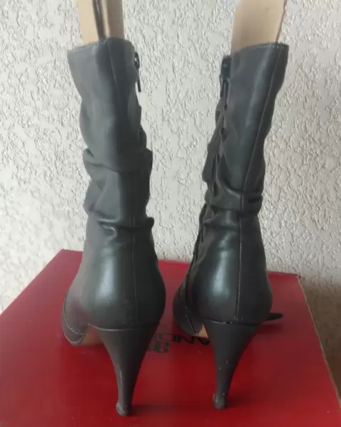Botas cortas de tacón alto.. Lindas botas cortas de tacón alto, en piel, color gris oscuro, diseño corrugado, botas sexys de stilettos de punta estrecha. Tacón de 7 cm. Talla: 2.5**Detalles en tacón y puntas.🧐💝 Si te gusta algo más de mi clóset podemos armar un paquete a un excelente precio 😄😃