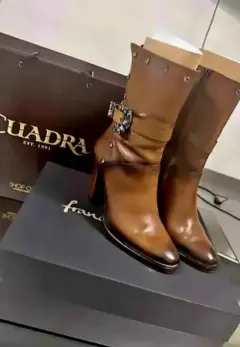 Botas cuadra. Con acabado sombreado pintado a mano, aplicaciones de cristales auténticos en los costados y sobre hebilla metálica.Suela de cuero de doble densidad, con injerto de TPUForro y plantilla en piel de bovinoAltura de tacón de aproximadamente 9 cm.Las use por horas,en realidad pudiera decir están nuevas.