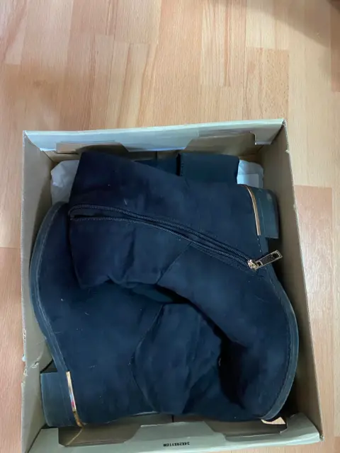 BOTAS DE CAÑA ALTA DE GAMUZA NEGRA. HERMOSAS BOTAS LARGAS, CUBREN LA RODILLA, son súper cómodas porque son flats, la caña es de tela suavecita por que son muy flexibles, tienen dorado en la parte del talón. En buen estado. Se entregan en caja, no rotas ni descosidas ni nada de eso. Les queda mucha vida