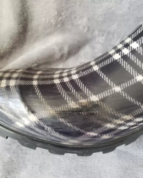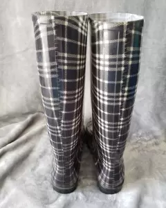 Botas de lluvia largas con estampado escoces blanco con negro, son talla 24 pero también quedan 24.5 en general en buen estado. Miden 31 cm de alto