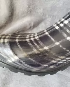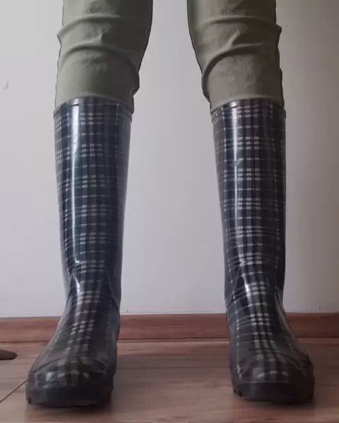 Botas de lluvia de estampado escocés. Botas de lluvia largas con estampado escoces blanco con negro, son talla 24 pero también quedan 24.5 en general en buen estado. Miden 31 cm de alto