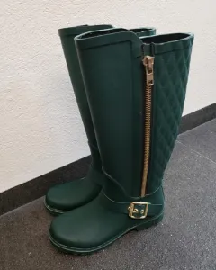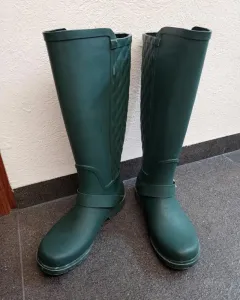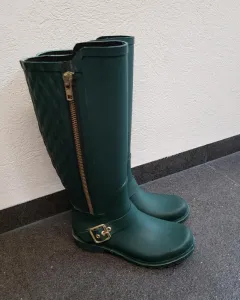 Botas de lluvia Steve Madden. Cómodas, forradas por dentro de textil y hule por fuera, aisla completamente el agua. Tienen cierre broche y detalles de quilt. Color verde botella. Talla 3. (Soy 3.5 generalmente y quedan perfectas con calcetas) tienen detallitos muy pequeños.