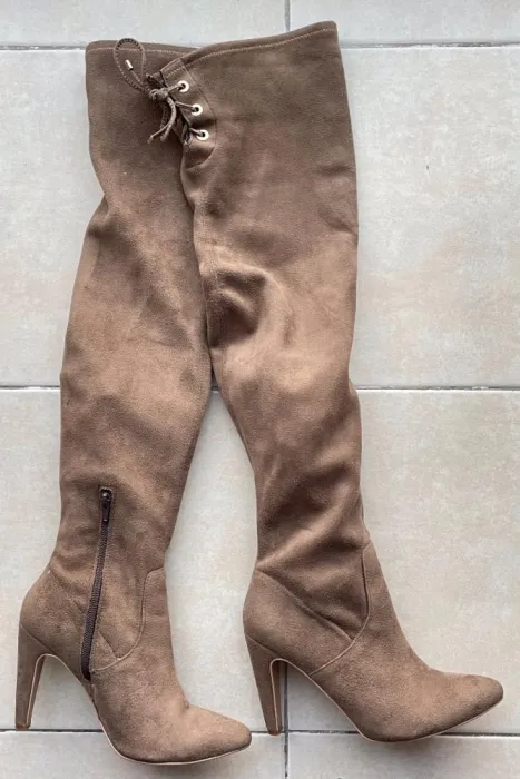 Botas largas. Botas largas, tacón de 10 cm, de gamuza color camel, son las hermanitas de las negras se usaron 1 vez también para las mismas fotos, talla 5.Buscamos quién las quiera estrenar!