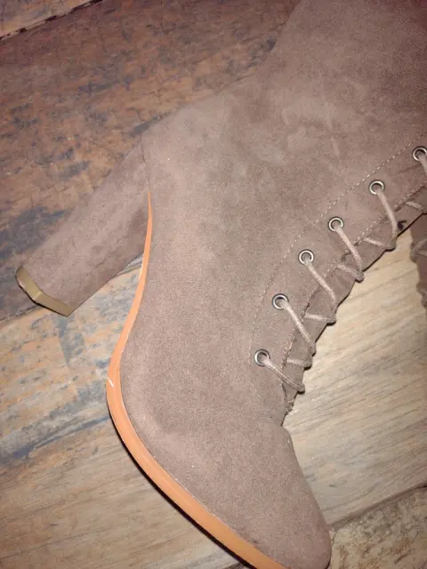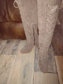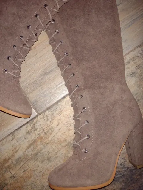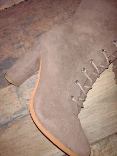 Botas largas de gamuza. Son botas abajo de la rodilla con detalle de tela en la parte de arriba con agujetas para ajustar
