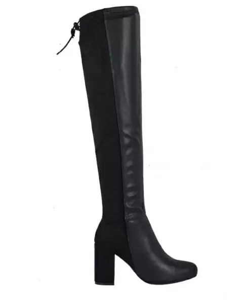 Botas largas negras. Descripción:Bota larga tubo color negra, mujer, ajuste con resorte, cierre lateral, tacón 8cm, piel sintética.El tacón es cómodo, mitad piel sintética y mitad tipo ante.Completamente nuevas ,listas para entrega inmediata.La medida del talón en adelante es de 46 cm.