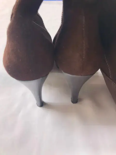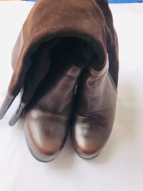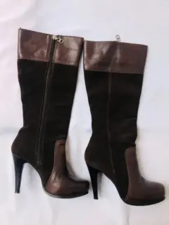 Botas largas WESTIESColor caféTalla 23Material cuero y gamuza Tacón alto 10cmLargo total de la bota 44 cmPor fuera están en perfecto estado No se le ve ningún detallePor dentro ya se está descarapelando la parte que trae cuero, lo nuestro en las ultimas fotos