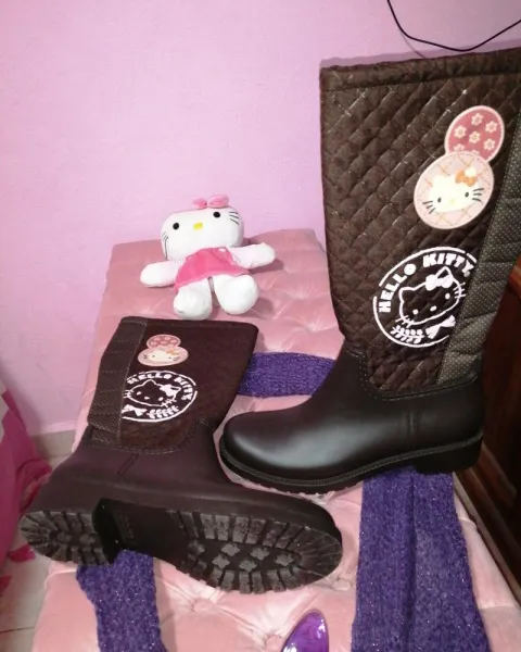 Hermosas botas para lluvía, Hello Kitty, en color café, trae a Hello Kitty en relieve y estampada, la parte de abajo del zapato es de material impermeable y lo de arriba de tela. Adentro una plantilla gruesa y afelpada.