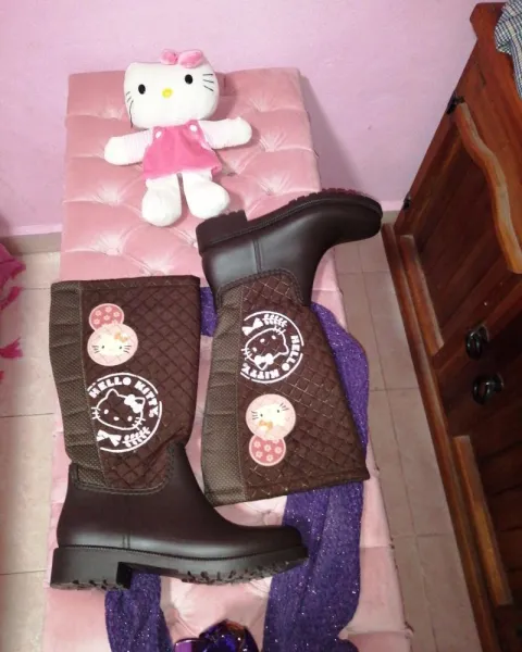 Botas para lluvía. Hermosas botas para lluvía, Hello Kitty, en color café, trae a Hello Kitty en relieve y estampada, la parte de abajo del zapato es de material impermeable y lo de arriba de tela. Adentro una plantilla gruesa y afelpada.
