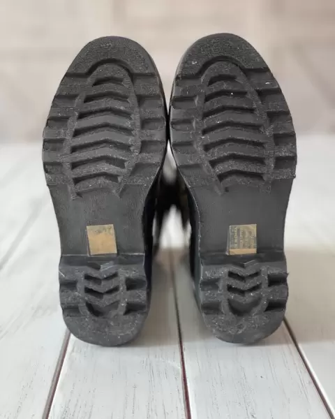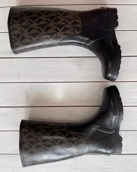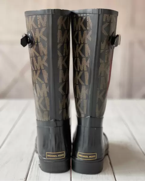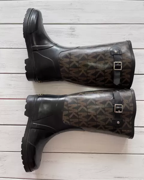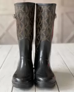 Talla: 4 mexicano Botas negras de hule, con logo emblema de MK en hebilla lateral en cada bota, talón y parte superior de las botas.Hebilla color plata.Miden: 35 cm de largo con todo y tacón el cuál mide 3 cm.La suela por fuera mide 25 cm.Alrededor de la pantorrilla mide 37 cm.Tiene mínimos detalles de uso que se aprecian en fotos.