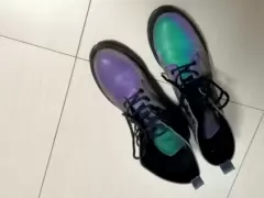Botas tornasol de agujetas negras. Diseño de bota negro a simple vista, con reflejos tornasol, talla 24, con suela negra