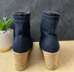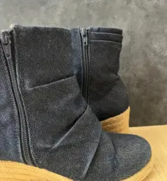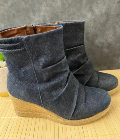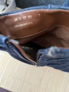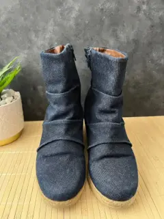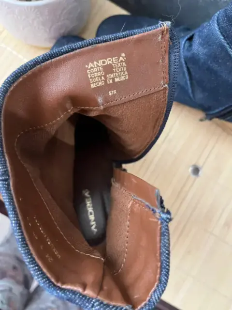 Botas vaqueras de mezclilla Andrea, talla 4.Tacón de plataforma, detalle de plisado al frente.Los cierres de las botas funcionan bien, tanto la mezclilla como el forro están en buen estado, sin suela gastada.