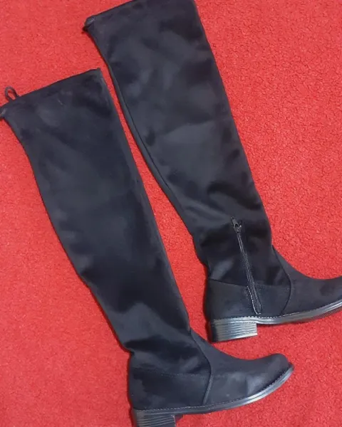 Bota alta de piso, llega arriba de la rodilla es color negro y trae agujetas para ajustarse, el material es de gamuza