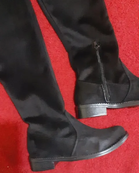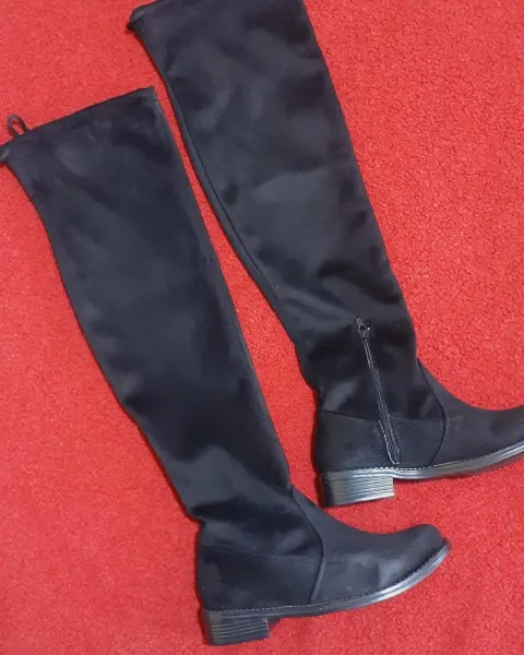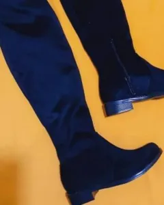 Bota alta de piso, llega arriba de la rodilla es color negro y trae agujetas para ajustarse, el material es de gamuza