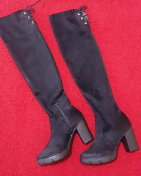 Bota alta con tacón de 7 cm, llega arriba de la es color negro y trae agujetas para ajustarse, el material es de gamuza