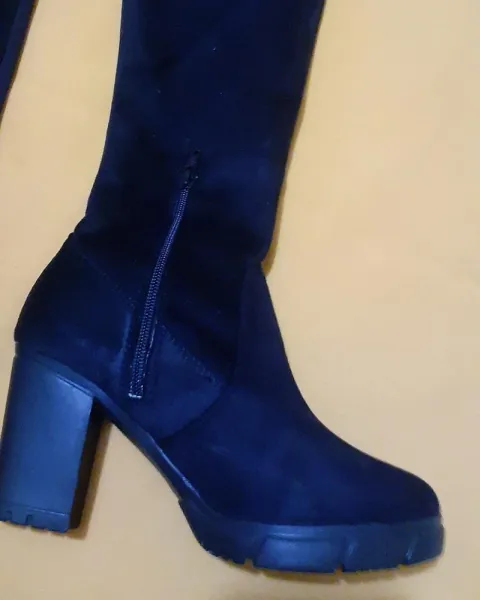 Bota alta con tacón de 7 cm, llega arriba de la es color negro y trae agujetas para ajustarse, el material es de gamuza