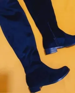 Bota alta de piso, llega arriba de la rodilla es color negro y trae agujetas para ajustarse, el material es de gamuza
