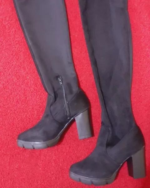 Bota alta con tacón de 7 cm, llega arriba de la es color negro y trae agujetas para ajustarse, el material es de gamuza