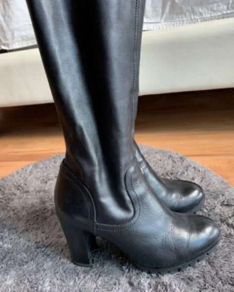 • Llegan arriba de la rodilla 54 cm largo • Piel combinado con vinipiel, un poco de desgaste en vinipiel por uso pero nada que afecte • Negras • Tacon 8.4 cm • Talla 3.5 pero queda a un 4