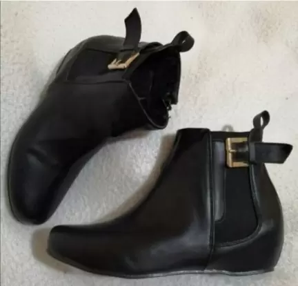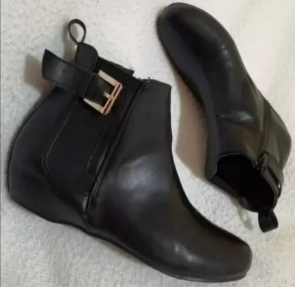 Hermoso botín de tacón corrido de 2.5cm de alto por dentro, diseño de ebilla dorada y resorte kiut con cierre lateral interno para fácil poner, piel-sintética Negro. México es Número #24cm. Código de descuento en tu primera compra: lucyrmxXqQJ9