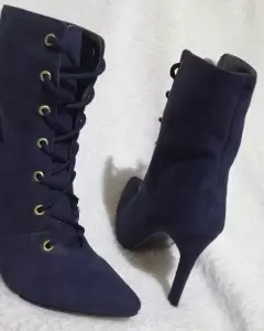 Hermoso botín de agujetas tacón de aguja 10cm color azul marino gamuza textura terciopelo de piel de durazno. Mexicano Número #26cm. Aplica mi código y tu primer compra en la App tiene descuento.