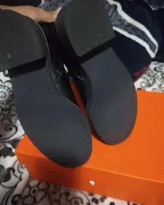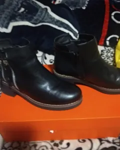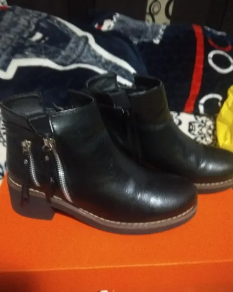 Bonitos botines negros, cortos, el material es sintético tipo piel, muy bonitas y cómodas, la altura del tacón 3 cm, talla 24.
